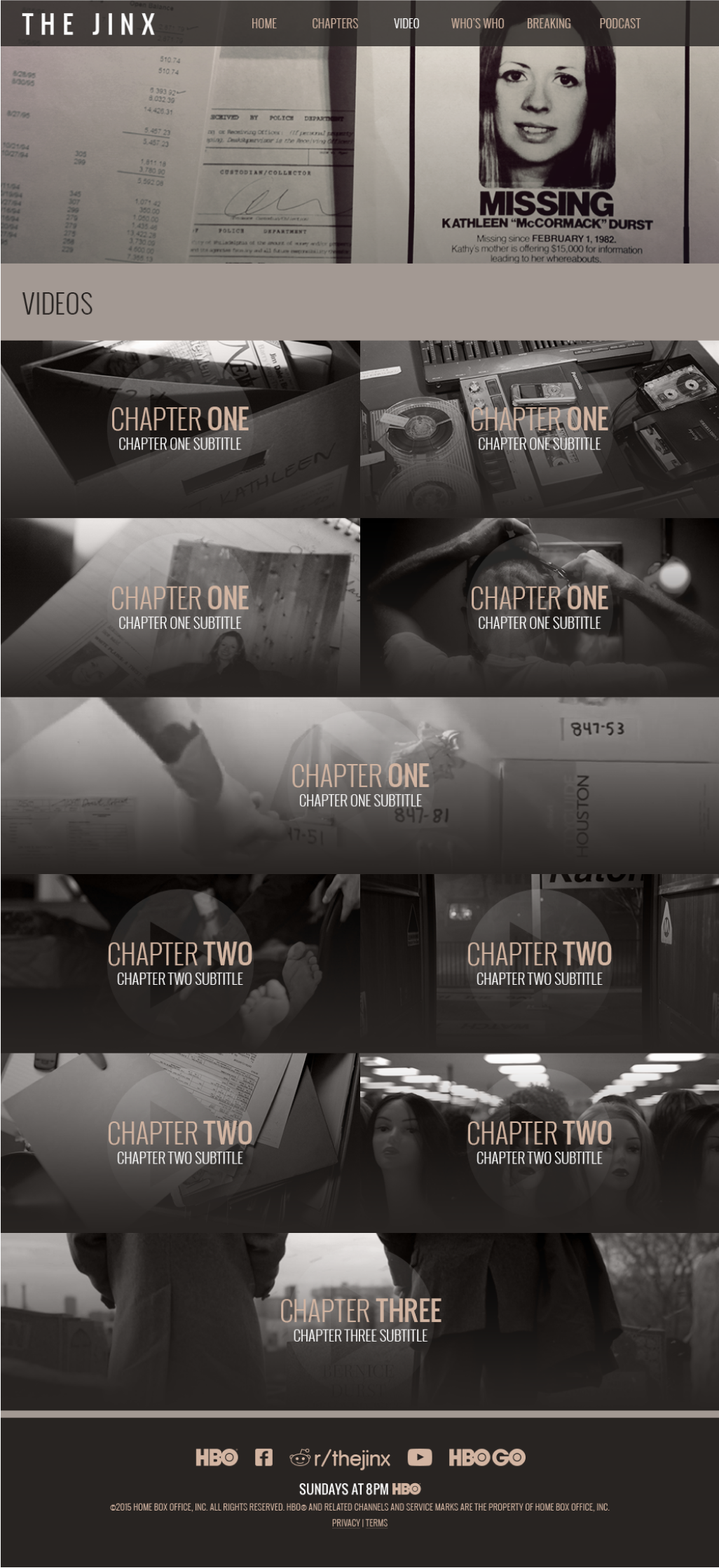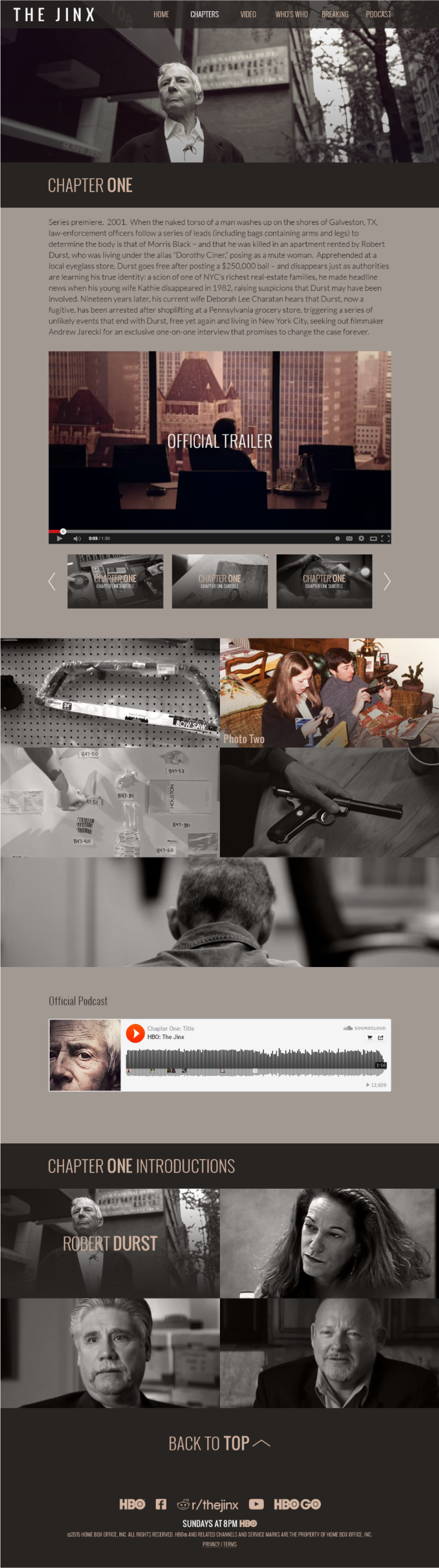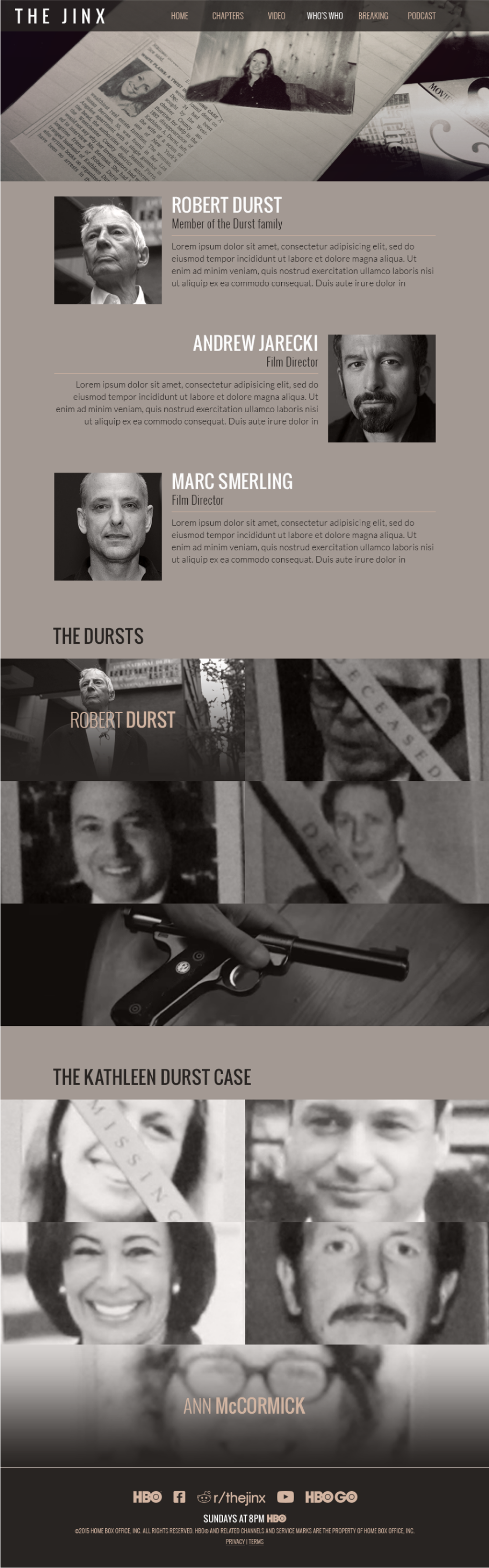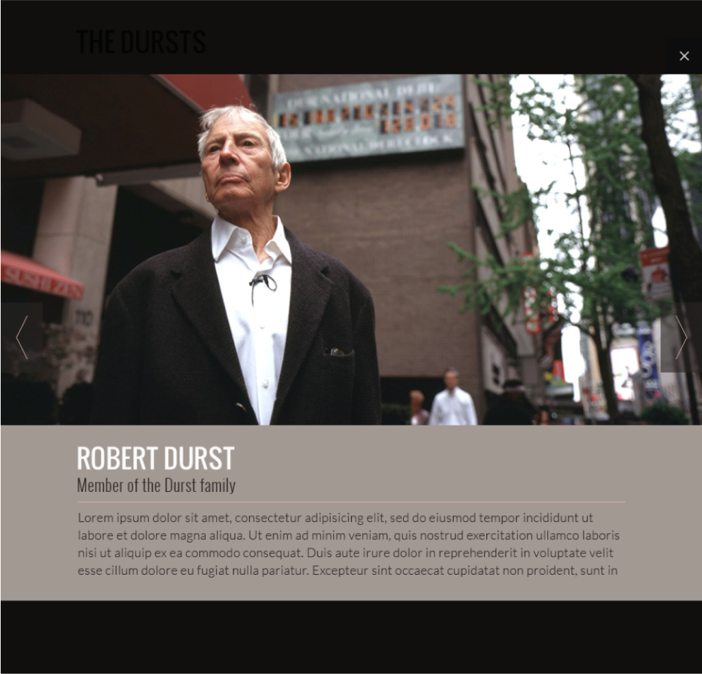 I created a page as a dedicated reference point for all individuals involved in the show. This included everyone from the show’s main subject, Robert Durst, to the people he grew up with, the investigators involved in the crimes documented in the show, and everyone else right down to the show’s creators, Andrew Jarecki and Marc Smerling.